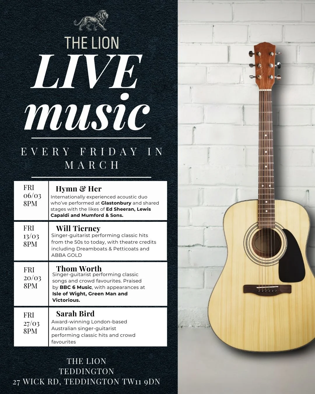 🎸 Musical March is ON! 🎶 We're turning the pub into a live music hotspot every single Friday this month. With a lineup that touches every corner of the music map, there's a perfect sound to suit every taste. Diaries out, dancing shoes on, vocal cords readied.